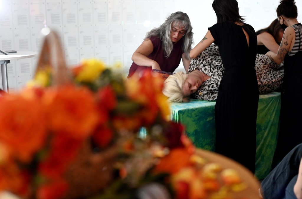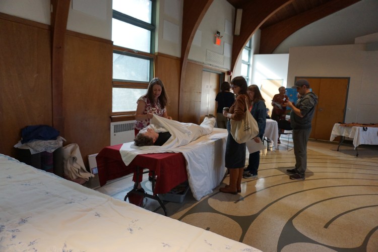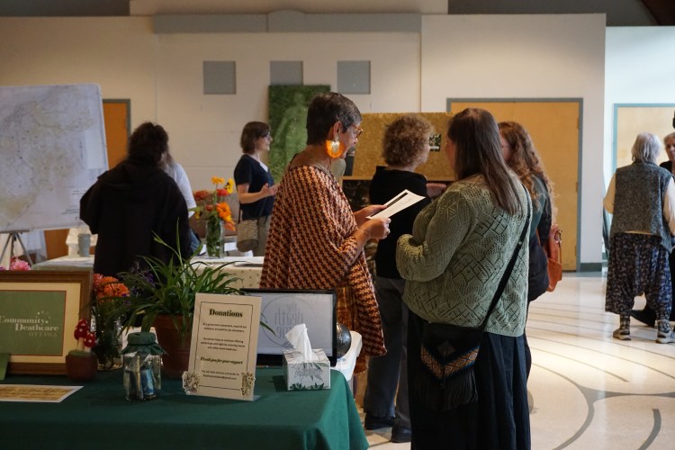 Kelly Butler and Debbie Charbonneau, members of Community Deathcare Ottawa, demonstrated body care and a home vigil. They created an invitation to imagine the potential healing and meaning-making found in family-led care. Guests were invited to participate in this timeless practice that is still alive and well in many cultures, and slowly being reclaimed by the deathcare movement.