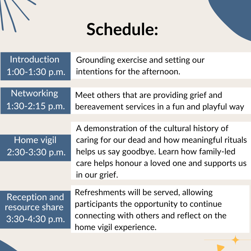 Included was a brief overview of legalities and rights of family-led deathcare in Ontario, the role of a death doula, and the importance of pre-planning and having conversations within one’s community to support empowered and informed decision-making at an incredibly challenging time.